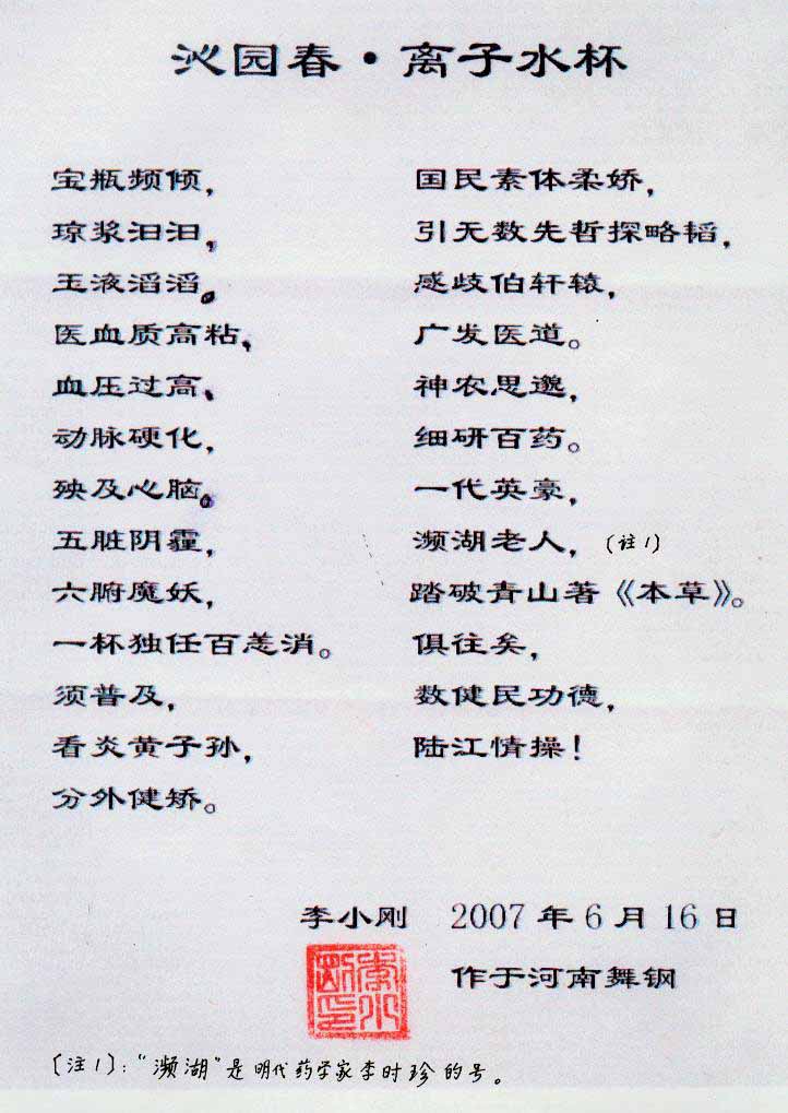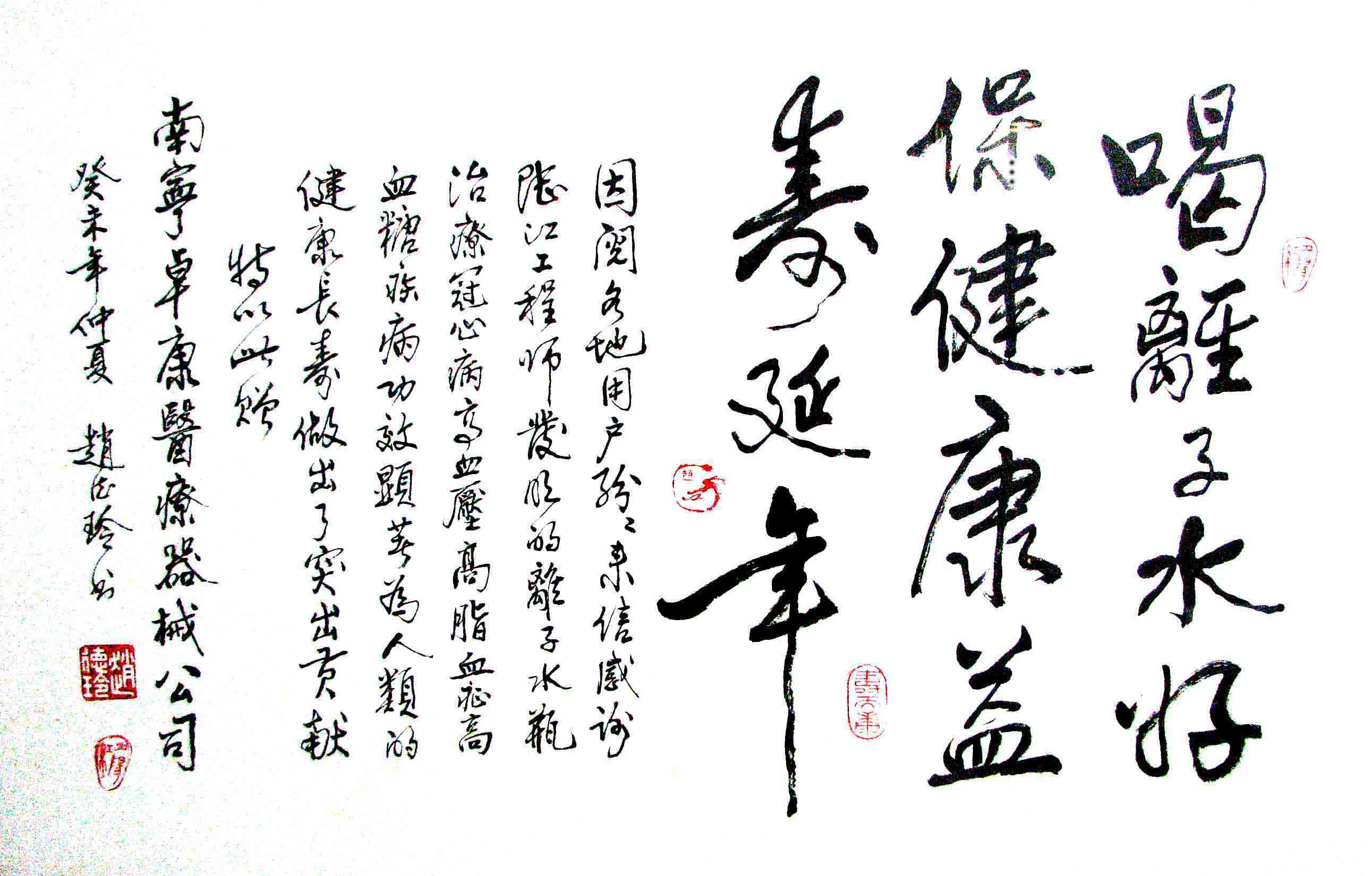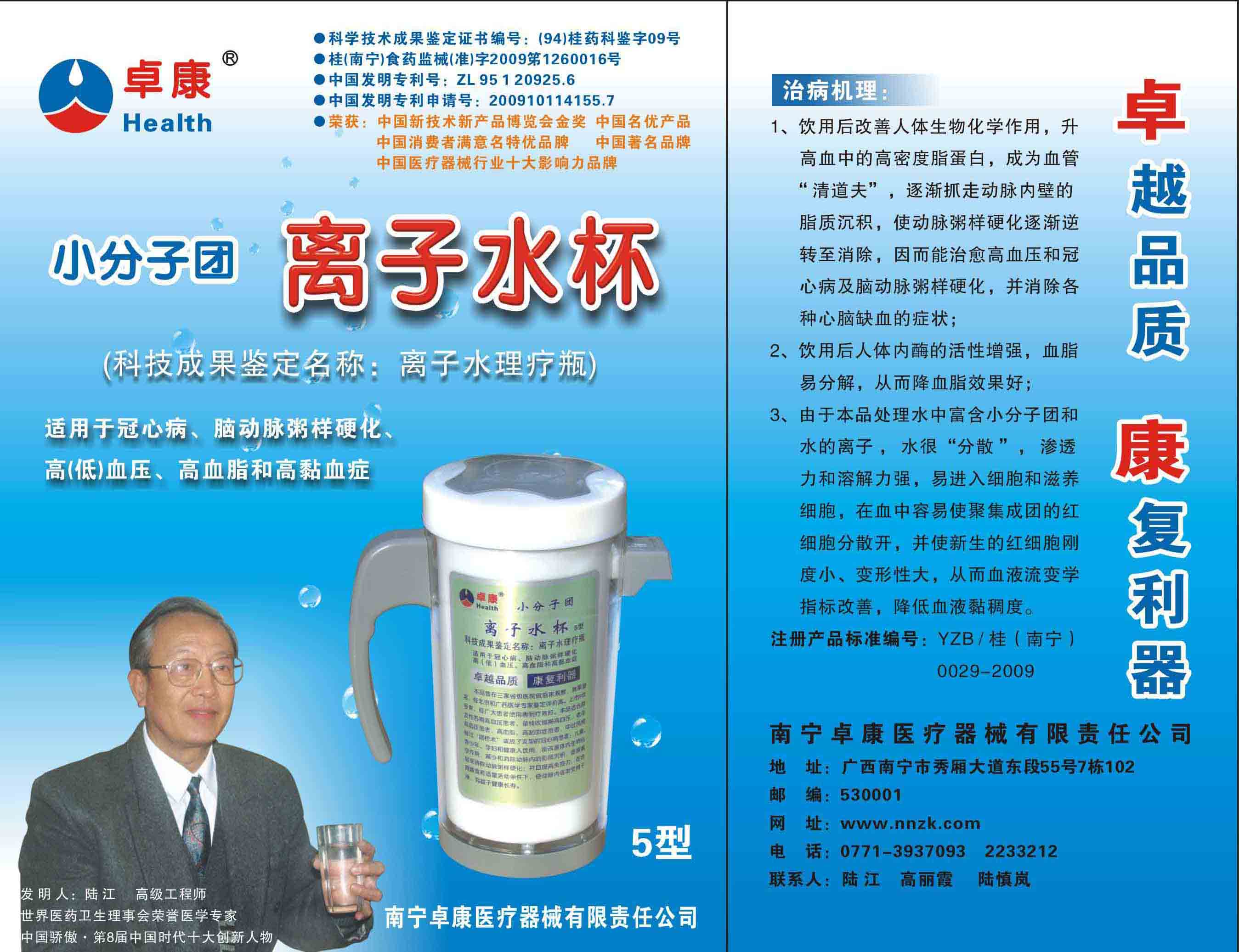 -----我是從事建筑的高工,本來沒有資格去攻克醫(yī)學(xué)難題,卻為了自身健康才扣響醫(yī)學(xué)的大門。由于我1990年患高血壓,因怕中風(fēng)才研究發(fā)明了離子水瓶,我把水處理成微小分子團水,飲用后治愈了高血壓。便于1993年底送到三家省級醫(yī)院做臨床試用4個月。經(jīng)北京和廣西醫(yī)學(xué)專家鑒定:"降脂降壓效果好"," 能擴大心腦動脈流量,改善心腦電圖以及微循環(huán)","對治療心腦動脈粥樣硬化、高血壓、高血脂有良好的醫(yī)療保健作用。""產(chǎn)品的技術(shù)性能和療效達到了同類產(chǎn)品的國內(nèi)領(lǐng)先水平,經(jīng)廣西醫(yī)學(xué)科學(xué)情報研究所檢索,未見國外有類似報道。"中國醫(yī)學(xué)科學(xué)院張正國教授從美國國立醫(yī)學(xué)圖書館數(shù)據(jù)庫存Medline檢索英俄文資料,均未見類似報告。2000年上市后,我為了對消費者負責(zé)而繼續(xù)觀察研究,一直通過《信譽卡》和《質(zhì)量跟蹤調(diào)查書》向患者承諾療效,請用戶使用6個月后反饋效果。和脂壓患者飲用2至5個月內(nèi),消除癥狀,停服藥物,血壓正常;冠心病患者飲用3~5個月逐漸減輕至消除心絞痛、房顫等癥狀,不再服藥,飲用1年左右心電圖正常,經(jīng)冠脈造影掃描無明顯狹窄,表明冠心病痊愈。大量患者還反映許多衰弱器官被修復(fù),讓前列腺增生、慢性咽喉炎、慢性氣管炎、支氣管炎、慢性胃炎、腸炎和膽囊炎等不藥而愈;2型糖尿病患者是因為胰島衰弱致病,飲用該水半年至一年,逐漸減藥至停藥,血糖尿糖正常,真正治愈2型糖尿病。中風(fēng)后遺癥患者飲用六七個月,可逐漸減輕至消除肢體和語言障礙,表明飲用該水能讓壽命很長的神經(jīng)元細胞逐漸修復(fù),奇跡般地恢復(fù)肢體和語言功能。飲用后還使胸腺和脾臟兩個重要的免疫器官被修復(fù)和增強,產(chǎn)生免疫細胞多,提高了免疫力,使人不生病或少生病。自此, 飲用微小分子團水創(chuàng)造了攻克冠心病、高(低)血壓和糖尿病三大醫(yī)學(xué)難題的奇跡。人們對此感到不可思議,但實踐是檢驗真理的唯一標(biāo)準。